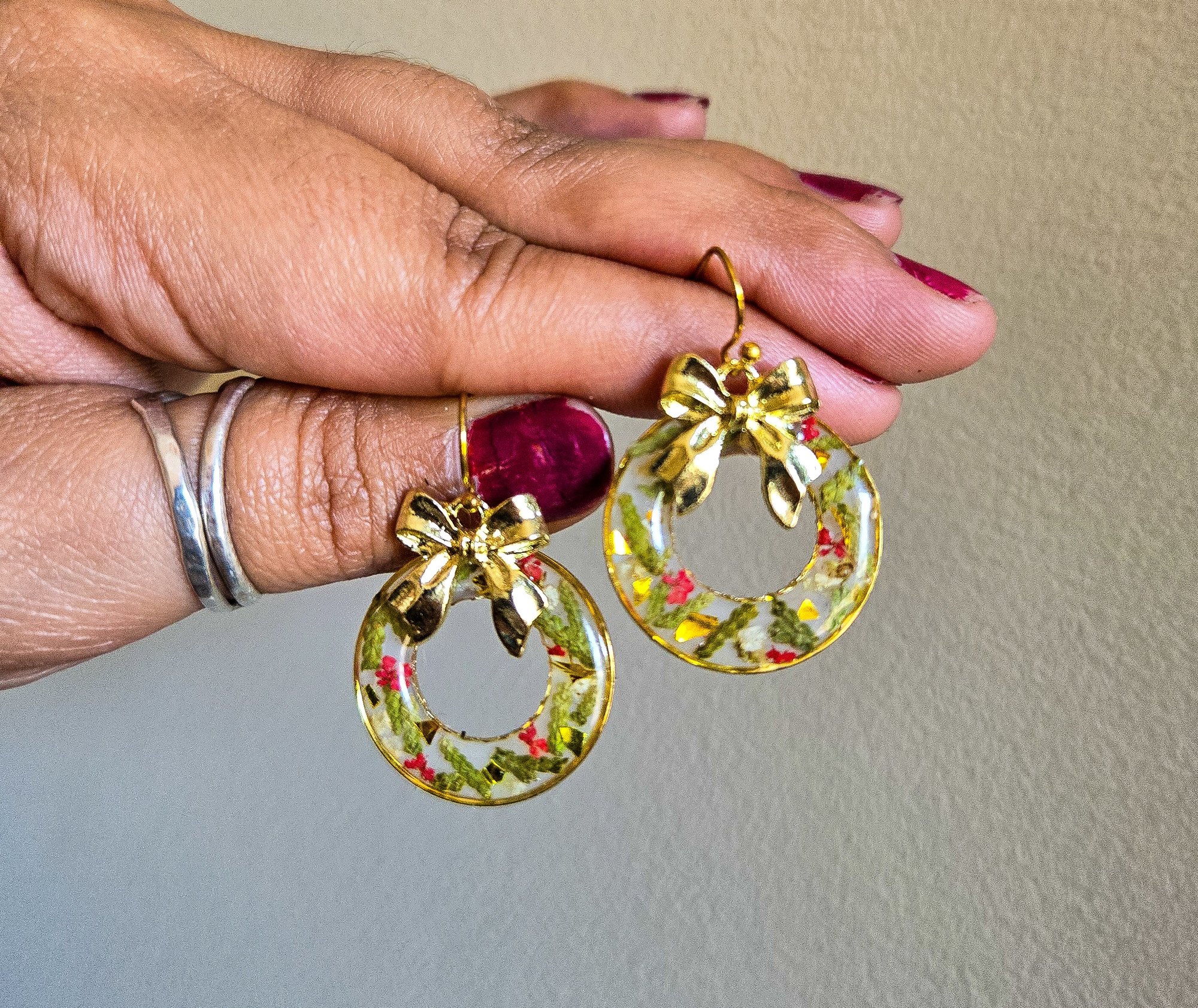 Various botanicals in brass bezels, alloy bow charm, 14k Gold plated hypoallergenic hooks.
