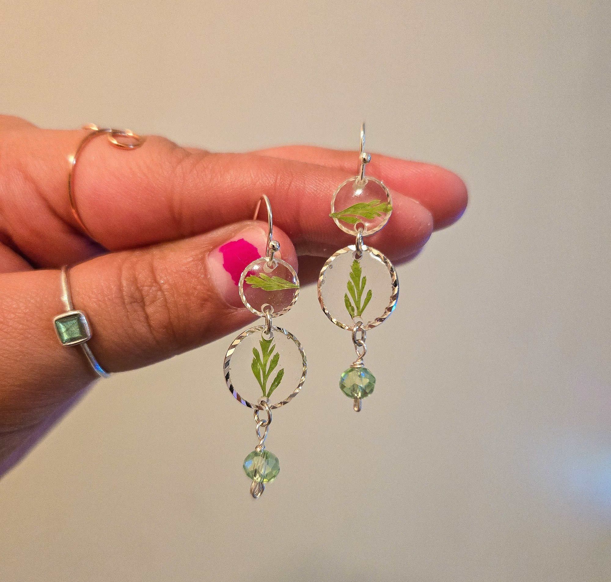 Pressed florals, sterling silver plated bezels, glass bead, sterling silver plated hypoallergenic hooks