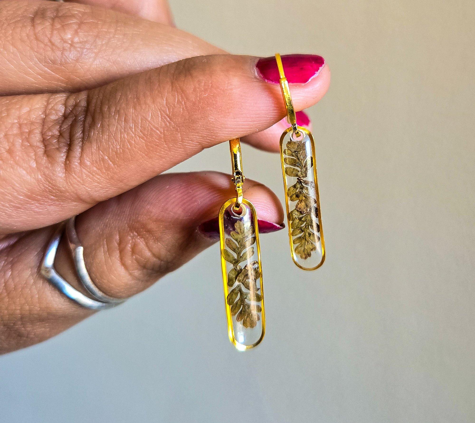 Pressed ferns in brass bezels, hypoallergenic huggie hoops.