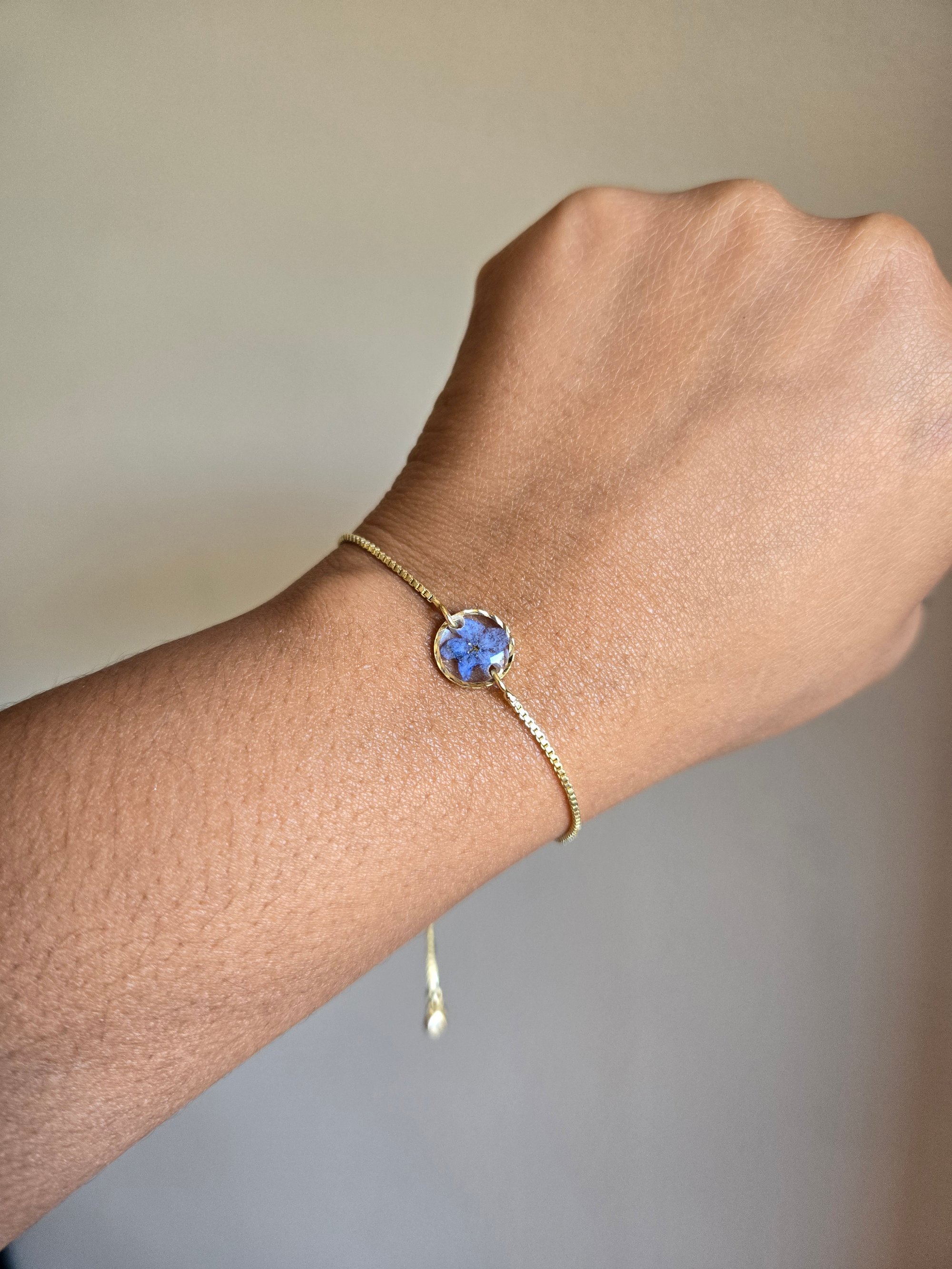 Single forget me not floral in gold plated bezel, stainless steel gold plated slider bracelet