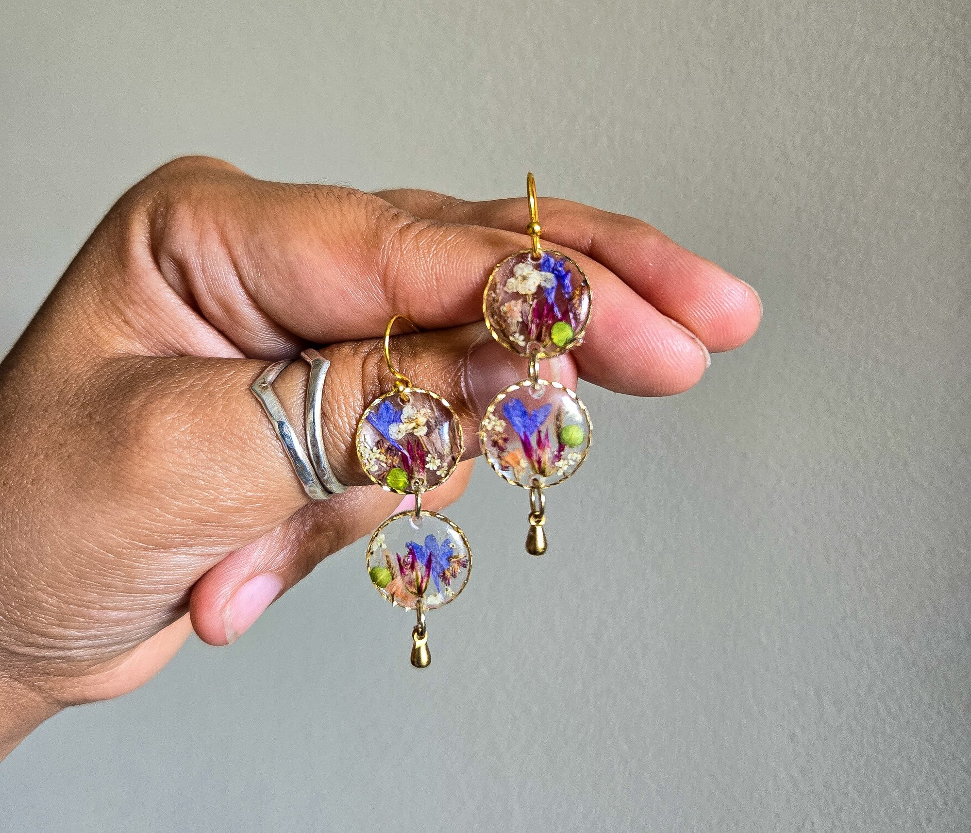 Mini pressed florals in brass bezels, brass charm, 14k Gold plated hypoallergenic hooks