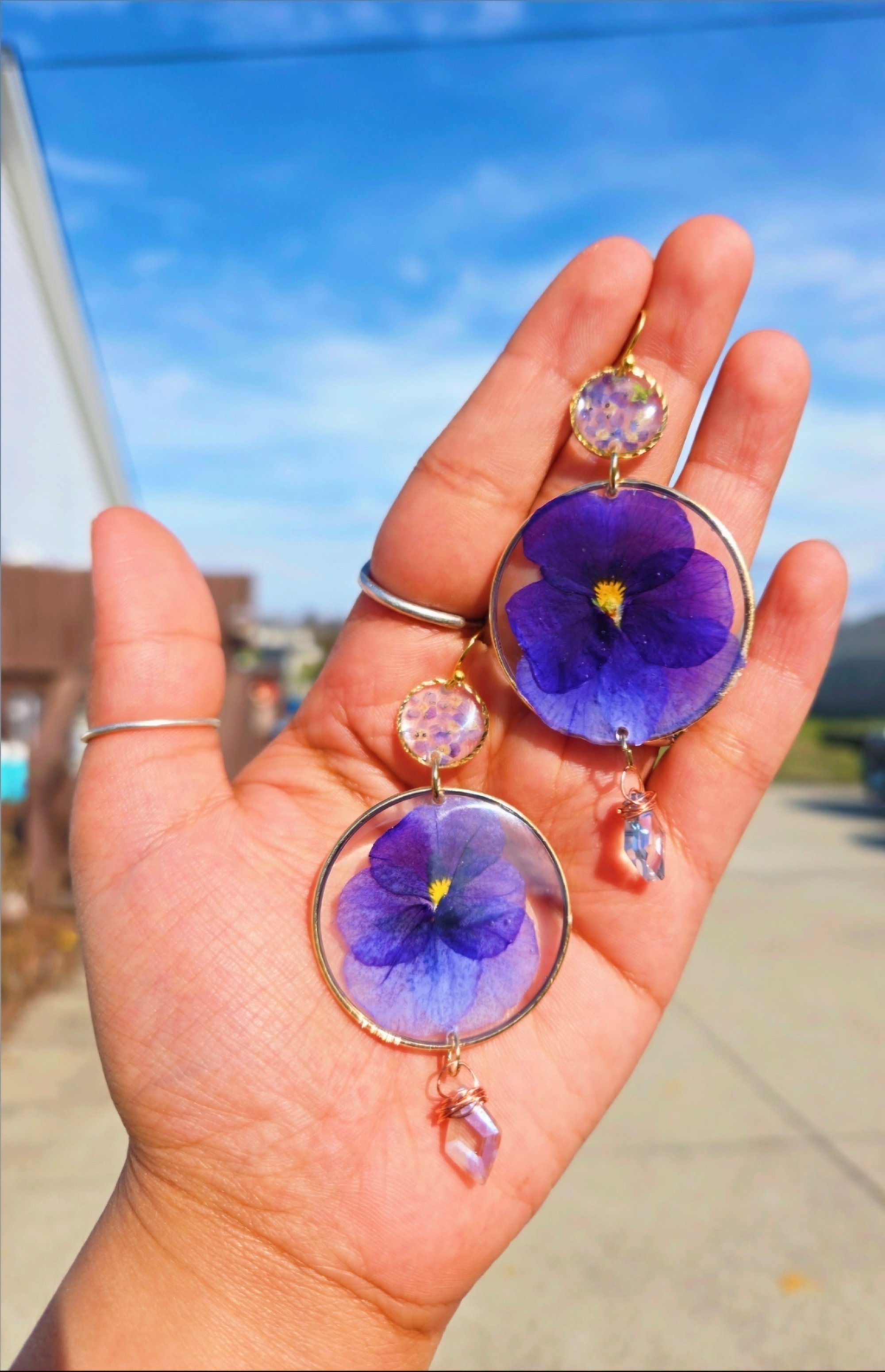 Pressed florals, gorgeous baby blue glass charms, 14k Gold plated hypoallergenic hooks