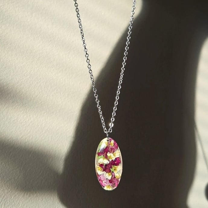 Pressed florals, stainless steel 18" chain