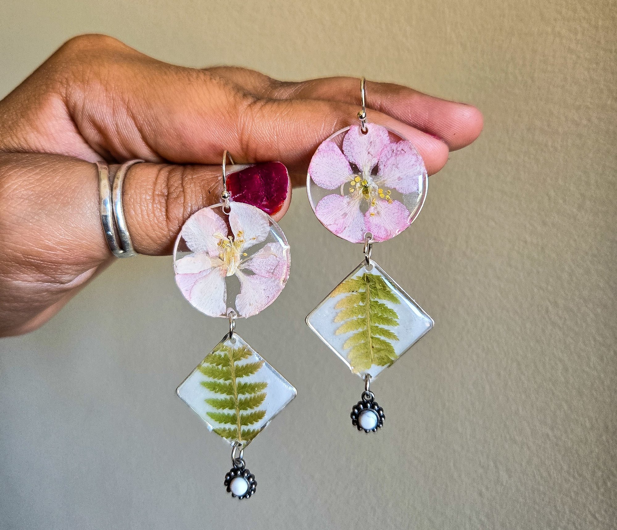 Pressed Larkspurs and ferns, charms, sterling silver plated hypoallergenic hooks