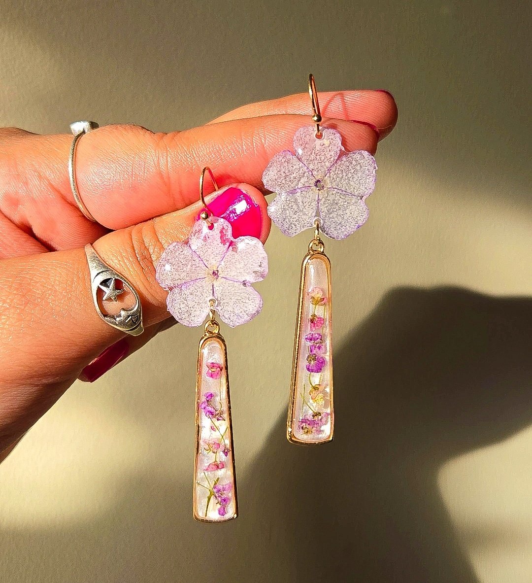 Pressed florals, faux gemstone charms, 14k Gold plated hypoallergenic hooks
