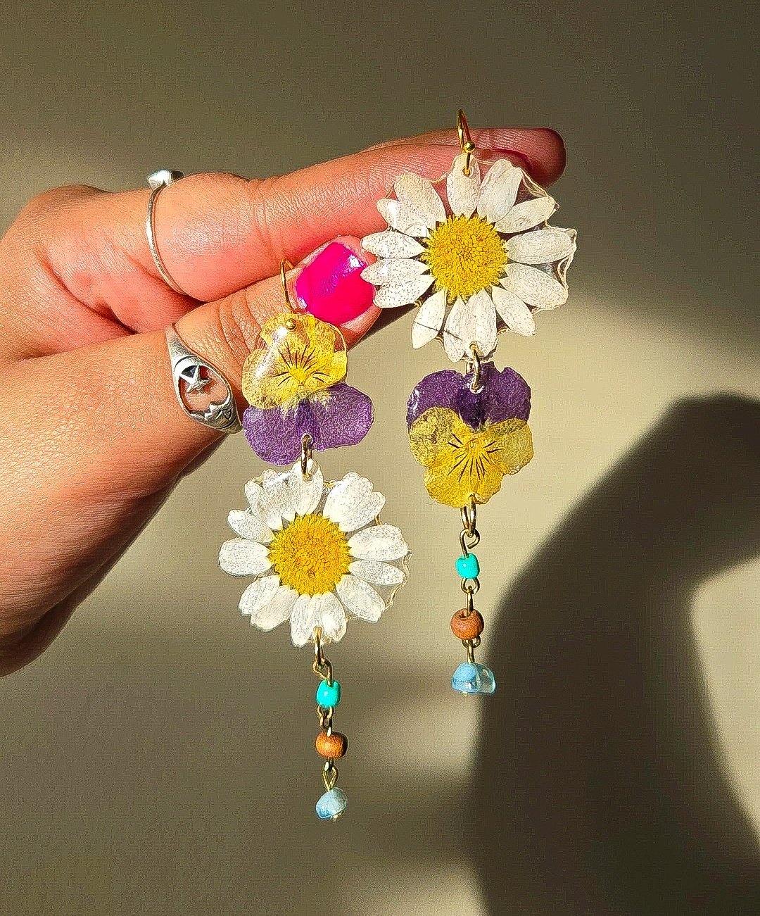 Pressed florals, beaded charms, 14k Gold plated hypoallergenic hooks